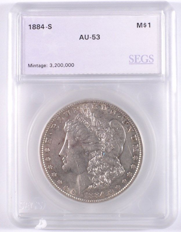 1884-S MORGAN SILVER DOLLAR, SEGS AU-53 NICE!