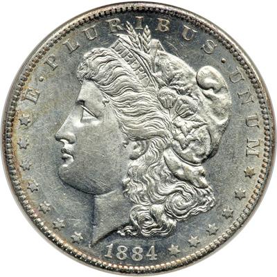 1884-S Morgan Dollar. NGC graded AU-55 Prooflike. Fully brilliant with just the faintest evidence of friction. Desirable scarce S-mint date (PCGS # 7157) .