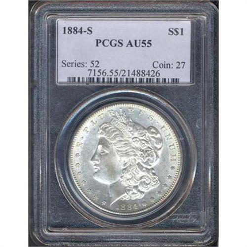 <b>1884-S Morgan Dollar. PCGS graded AU55.</b> Frosty white with only a bare trace of friction on the high points. For years, this quality has passed around the bourse floors as full mint state. A very attractive example of this tough date <b>(PCGS # 7156)</b>