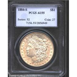 1884-S S$1 AU55 PCGS. The margins have flashy luster. The fields and highpoints have light yellow-gray patina. A problem-free representative of this conditionally rare issue. Important notice: We expect to be auctioning lots at the rate of 200-250 per hour. Sometimes eBay Premier live bid software cannot keep up with that pace, so we strongly recommend that you place a realistic proxy bid now as insurance to avoid disappointment. Also please note that all Heritage/CAA lots purchased through eBay Premier carry a 20% Buyer's Premium. Please make sure you read the Terms and Conditions.