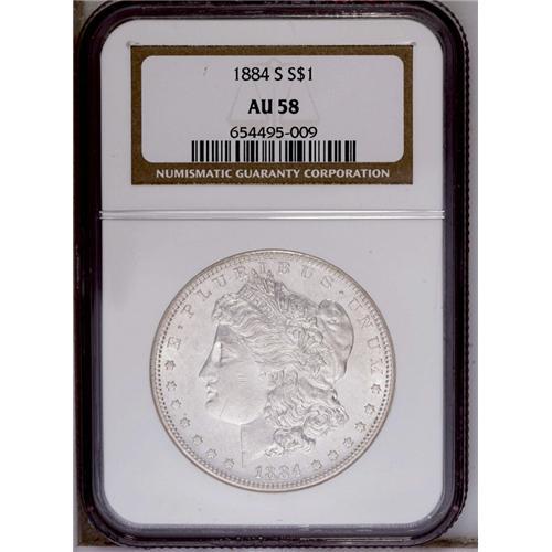<B>1884-S<img border='0' src='http://www.heritagecoins.com/images/star.gif' width=10 height=10>$1> AU58 NGC.</B></I> Although the surfaces are lightly hairlines with other minor abrasions, it is an attractive and nearly fully lustrous example. This date is a condition rarity with few true Mint State examples remaining today. <BR><BR><B>Important notice:</B> Heritage usually auctions material at the rate of 200-250 lots per hour. On some occasions eBay Live bid software or the Internet may not be able to keep up with the pace of the auction. We recommend placing a realistic absentee bid now as insurance to avoid disappointment. Occasionally the auctioneer may eliminate or reject an eBay Live bid, and the auctioneer may also reopen a lot after the close of the eBay live bidding (usually because we missed an audience bid), and may reject your bid even if it shows you as the winning bidder. By bidding via eBay Live, you agree that Heritage may award the lot to another bidder at its sole discretion under the circumstances described above or any other reasonable circumstances. Since eBay bids are not shown to us until we open the lot on the floor, we treat those bids just like floor bids. In most cases the floor responds before the eBay bid is presented to us, due to Internet lag time, so for consistency we have made it a policy that floor bids are always considered first over tie eBay live bids. Also please note that all Heritage lots purchased through eBay Live carry a 20% Buyer's Premium. Please make sure you read the Terms and Conditions before you bid. This lot is being auctioned in conjunction with a live floor auction by Heritage Galleries & Auctioneers. All final auction and invoice information will be supplied by Heritage Galleries & Auctioneers, and all other information should be considered preliminary. Lot:3410 <BR><BR><B>Winning Notification and Billing:</B> After the FINAL session in this auction is complete, Heritage will send e-mail and snail mail invoices. This process normally takes several days. All final auction and invoice information will be supplied by Heritage Galleries & Auctioneers, and all other information should be considered preliminary. <BR><BR>This auction will be conducted on a live auction floor and over the Internet through eBay Live. If you choose to place an absentee bid, please take a moment to <font color='#0000ff'><u><a href='http://pages.ebay.com/liveauctions/help/before/laabsentee.html'>learn how eBay Live absentee bidding works</a></u></font><font color='#000000'>