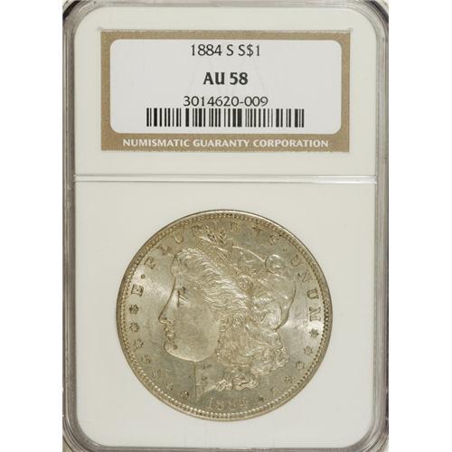 1884-S S$1 AU58 NGC. Ample luster is retained on light