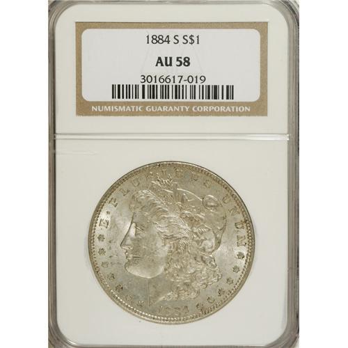 1884-S S$1 AU58 NGC. Considerable luster occurs on sil