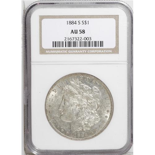 1884-S S$1 AU58 NGC. Highly lustrous with just a touch