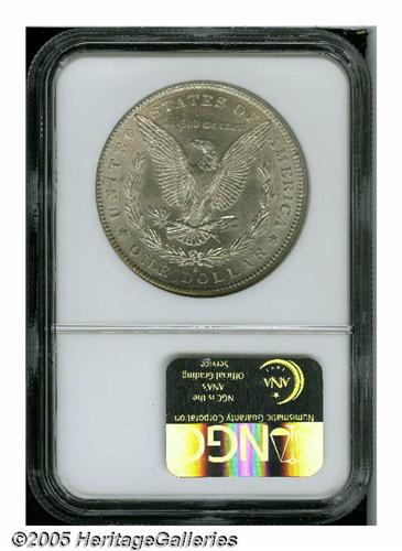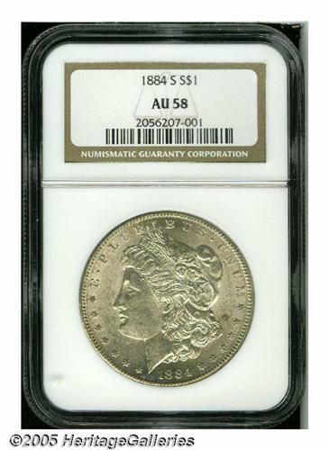 <B>1884-S<S$1> AU58 NGC.</B></I> Just the slightest trace of friction is apparent on this scarce, semi-key issue. Silver-gray surfaces retain nice luster, and exhibit small to moderate contact marks on Liberty's cheek and in the left (facing) obverse field. The design elements are well impressed, though the hair over Liberty's ear is somewhat weak.