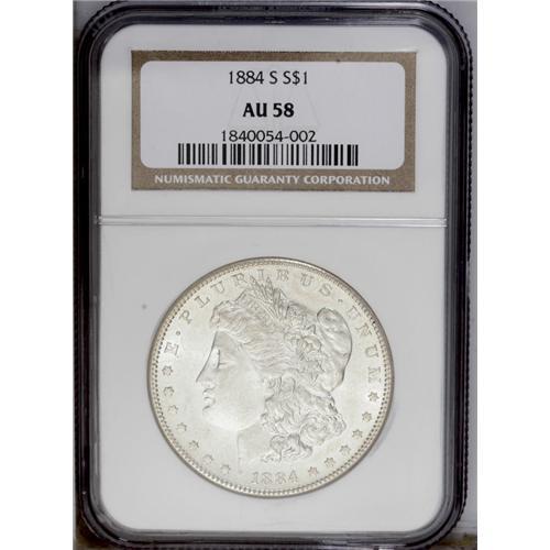 1884-S S$1 AU58 NGC. Mostly lustrous, but with a touch