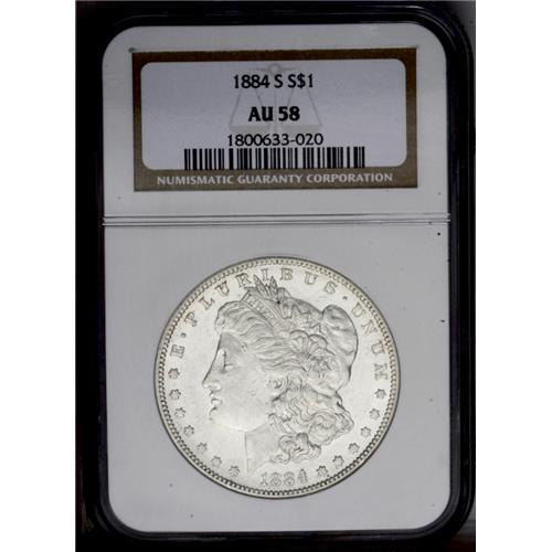<B>1884-S<img border='0' src='http://www.heritagecoins.com/images/star.gif' width=10 height=10>$1> AU58 NGC.</B></I> Sweeping luster is nearly complete, but diminishes across the open fields. Delicate steel-gray and tan toning visits lightly marked surfaces. The 1884-S is a notorious conditional rarity. <BR><BR><B>Important notice:</B> Heritage usually auctions material at the rate of 200-250 lots per hour. On some occasions eBay Live bid software or the Internet may not be able to keep up with the pace of the auction. We recommend placing a realistic absentee bid now as insurance to avoid disappointment. Occasionally the auctioneer may eliminate or reject an eBay Live bid, and the auctioneer may also reopen a lot after the close of the eBay live bidding (usually because we missed an audience bid), and may reject your bid even if it shows you as the winning bidder. By bidding via eBay Live, you agree that Heritage may award the lot to another bidder at its sole discretion under the circumstances described above or any other reasonable circumstances. Since eBay bids are not shown to us until we open the lot on the floor, we treat those bids just like floor bids. In most cases the floor responds before the eBay bid is presented to us, due to Internet lag time, so for consistency we have made it a policy that floor bids are always considered first over tie eBay live bids. Also please note that all Heritage lots purchased through eBay Live carry a 20% Buyer's Premium. Please make sure you read the Terms and Conditions before you bid. This lot is being auctioned in conjunction with a live floor auction by Heritage Galleries & Auctioneers. All final auction and invoice information will be supplied by Heritage Galleries & Auctioneers, and all other information should be considered preliminary. Lot:3412 <BR><BR><B>Winning Notification and Billing:</B> After the FINAL session in this auction is complete, Heritage will send e-mail and snail mail invoices. This process normally takes several days. All final auction and invoice information will be supplied by Heritage Galleries & Auctioneers, and all other information should be considered preliminary. <BR><BR>This auction will be conducted on a live auction floor and over the Internet through eBay Live. If you choose to place an absentee bid, please take a moment to <font color='#0000ff'><u><a href='http://pages.ebay.com/liveauctions/help/before/laabsentee.html'>learn how eBay Live absentee bidding works</a></u></font><font color='#000000'>