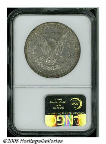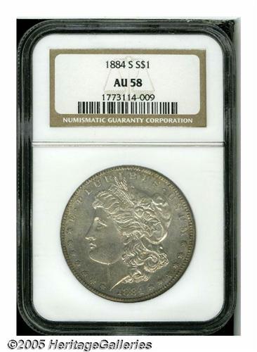 <B>1884-S<S$1> AU58 NGC.</B></I> This specimen has partially prooflike fields which present a mild contrast with the sharply struck design elements. Traces of golden-brown patina visit relatively clean surfaces that show just a couple of trivial marks on Liberty's cheek.