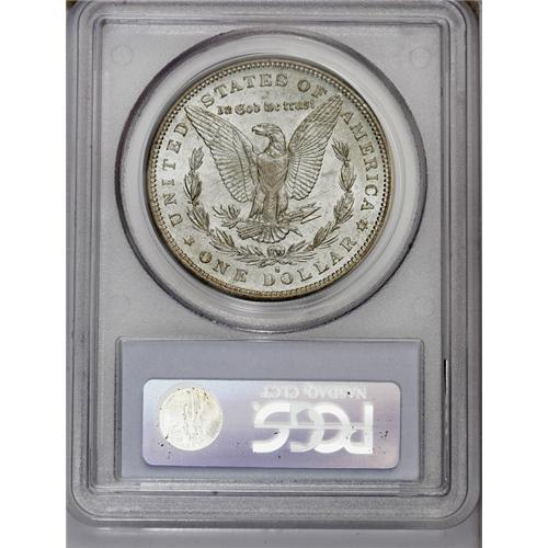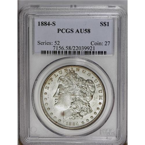 <B>1884-S<img border='0' src='http://www.heritagecoins.com/images/star.gif' width=10 height=10>$1> AU58 PCGS.</B></I> An impressive example of this important date with fully brilliant and lustrous silver surfaces. The highpoints, including Liberty's cheek and the hair over her ear, as well as the eagle's breast feathers, all show a trace of wear. A small lilac toning spot is visible along the leading edge of her neck.