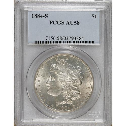 <B>1884-S S$1 AU58 PCGS.</B></I> The 1884-S is surprisingly scarce in grades approaching Mint State, given the availability of the 1878-S to 1882-S San Francisco issues. The eagle's breast and the hair above the ear show a trace of friction, but the luster is essentially complete, and consequential marks are absent.<BR><BR><b>Shipping:</b> Coins & Currency (<a target="_blank" href="http://www.heritageauctions.com/common/shipping.php">view shipping information</a>)