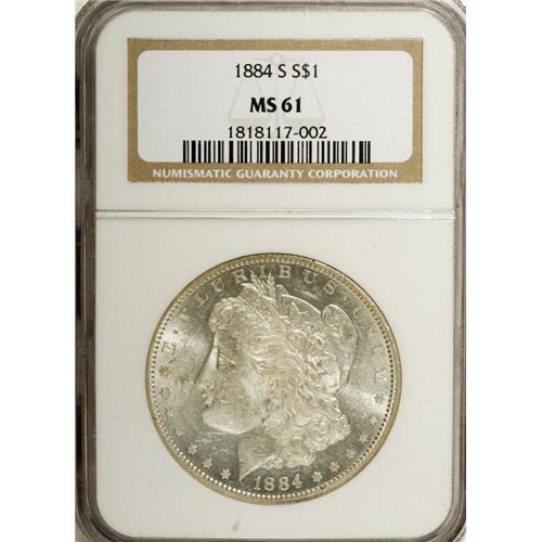 <B>1884-S S$1 MS61 NGC.</B></I> This is a fully Mint State example of the rare 1884-S Morgan dollar, usually encountered well circulated or with light rub. Although moderately abraded as suggested by the grade, this piece is fully brilliant with slightly reflective fields, and it presents excellent eye appeal.<BR><BR><b>Shipping:</b> Coin/Currency (<a target="_blank" href="http://www.heritageauctions.com/common/shipping.php">view shipping information</a>)