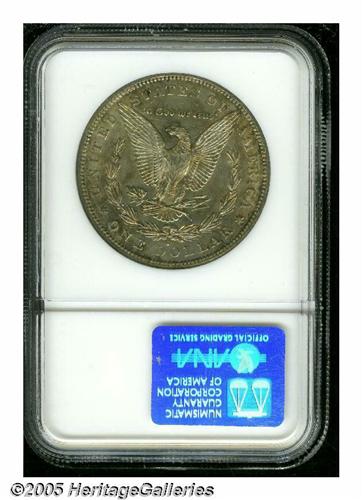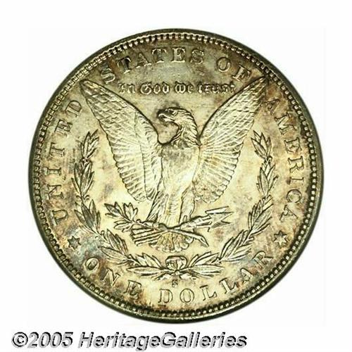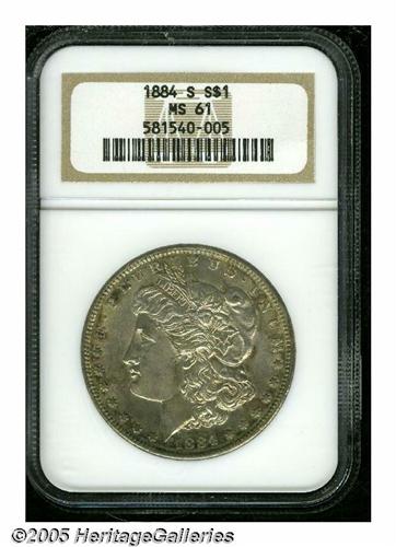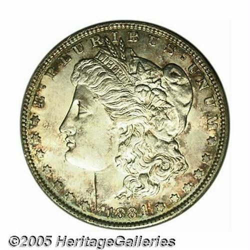 <B>1884-S<S$1> MS61 NGC.</B></I> Well struck for this prized condition rarity among S-mint Morgan Dollars, being accented in violet and sea-green shades. A modest degree of scuffiness is noted in the fields, thus limiting the Mint State classification.