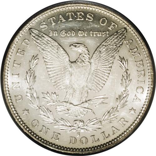 <B>1884-S<img border='0' src='http://www.heritagecoins.com/images/star.gif' width=10 height=10>$1> MS61 PCGS.</B></I> Something unusual occurred in San Francisco in 1884: Almost the entire mintage of 3.2 million silver dollars produced in that mint was dropped into circulation. With most Morgan dollar issues, large quantities of the original production run were bagged after minting and relegated to storage, many not seeing the light of day again until 1962-64. As a result, few 1884-S dollars were set aside in Uncirculated condition, and it is one of the "Big 5" Morgan dollars for the advanced collector.<BR> The obverse exhibits a semi-prooflike field that, unfortunately, helps accent some scuffiness in the fields on that side. Untoned and brilliant, this coin should fit nicely in an Uncirculated Morgan dollar set. An exceedingly difficult Morgan dollar to locate in any grade of Mint State. Worth a close look and a strong bid.<BR><I>From The Chicago-Ark Collection.</B></I>