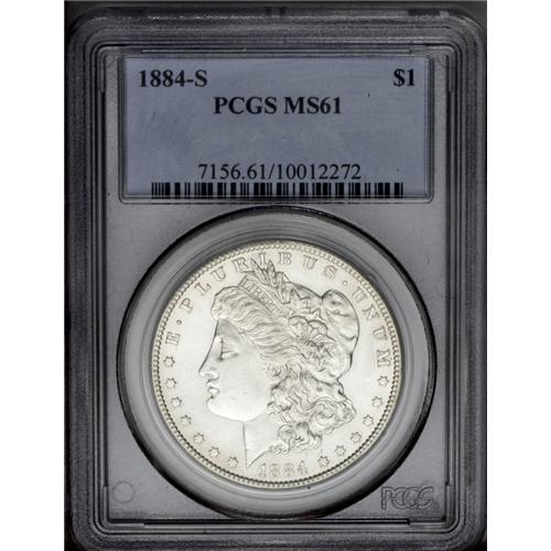 <B>1884-S<img border='0' src='http://www.heritagecoins.com/images/star.gif' width=10 height=10>$1> MS61 PCGS.</B></I> This is a fully brilliant Mint State example, and a condition rarity as such. Just a trace of striking weakness is noted over the ear and on the eagle's breast, with all other design points fully defined. Remarkably attractive for the grade with excellent surfaces. Only a few miniscule abrasions are present on each side. <BR><BR><B>Important notice:</B> Heritage usually auctions material at the rate of 200-250 lots per hour. On some occasions eBay Live bid software or the Internet may not be able to keep up with the pace of the auction. We recommend placing a realistic absentee bid now as insurance to avoid disappointment. Occasionally the auctioneer may eliminate or reject an eBay Live bid, and the auctioneer may also reopen a lot after the close of the eBay live bidding (usually because we missed an audience bid), and may reject your bid even if it shows you as the winning bidder. By bidding via eBay Live, you agree that Heritage may award the lot to another bidder at its sole discretion under the circumstances described above or any other reasonable circumstances. Since eBay bids are not shown to us until we open the lot on the floor, we treat those bids just like floor bids. In most cases the floor responds before the eBay bid is presented to us, due to Internet lag time, so for consistency we have made it a policy that floor bids are always considered first over tie eBay live bids. Also please note that all Heritage lots purchased through eBay Live carry a 20% Buyer's Premium. Please make sure you read the Terms and Conditions before you bid. This lot is being auctioned in conjunction with a live floor auction by Heritage Galleries & Auctioneers. All final auction and invoice information will be supplied by Heritage Galleries & Auctioneers, and all other information should be considered preliminary. Lot:3415 <BR><BR><B>Winning Notification and Billing:</B> After the FINAL session in this auction is complete, Heritage will send e-mail and snail mail invoices. This process normally takes several days. All final auction and invoice information will be supplied by Heritage Galleries & Auctioneers, and all other information should be considered preliminary. <BR><BR>This auction will be conducted on a live auction floor and over the Internet through eBay Live. If you choose to place an absentee bid, please take a moment to <font color='#0000ff'><u><a href='http://pages.ebay.com/liveauctions/help/before/laabsentee.html'>learn how eBay Live absentee bidding works</a></u></font><font color='#000000'>
