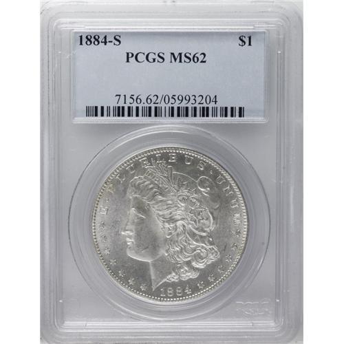<B>1884-S S$1 MS62 PCGS.</B></I> As any Morgan dollar collector is aware, the 1883-S and 1884-S issues are (starting from the 1878-S and moving forward) the first two difficult S-mint coins in the series, with the 1884-S much more difficult of the two. While well-circulated examples abound, specimens of the 1884-S are elusive in any Mint State grade. The present piece offers silver-white surfaces with good cartwheel luster, although there are numerous small abrasions present, and a small luster graze on Liberty's jawline requires singular mention. The reverse is choice for the grade, however, with a decent strike compared to many examples of this issue. A nice piece that could offer significant value to some fortunate--and forthright--bidder.<BR><BR><b>Shipping:</b> Coin/Currency (<a target="_blank" href="http://www.heritageauctions.com/common/shipping.php">view shipping information</a>)