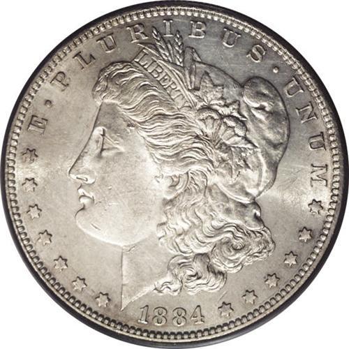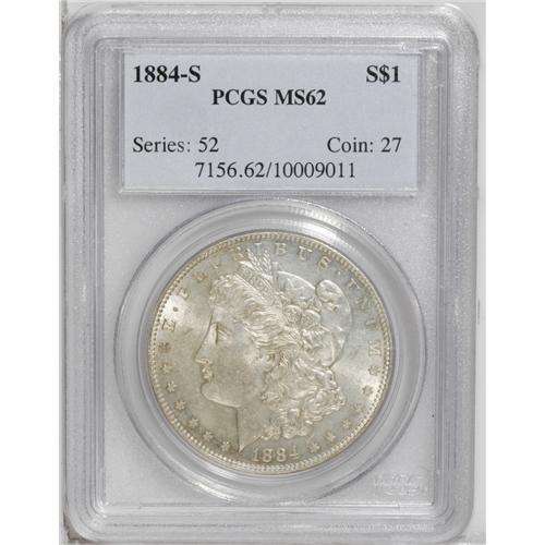 <B>1884-S<img border='0' src='http://www.heritagecoins.com/images/star.gif' width=10 height=10>$1> MS62 PCGS.</B></I> Satiny and lustrous with light champagne toning over slightly reflective surfaces. Slight weakness is noted at the center on each side. The surfaces are fully lustrous with minor abrasions as expected. These are mostly concentrated at Liberty's facial area, as well as the fields on each side. This is a major rarity among Morgan silver dollars in Mint State grades. Over the past 13 years since we started archiving our auction data, we have handled fewer than 100 Mint State examples of this issue, and less than 30 of those were certified by PCGS. Needless to say, most of the coins that we have offered were in the two lowest Mint State grade levels. An extremely important opportunity, even for the advanced collector.