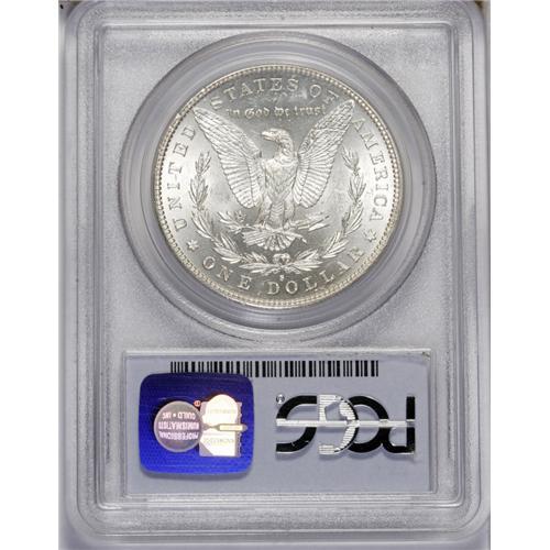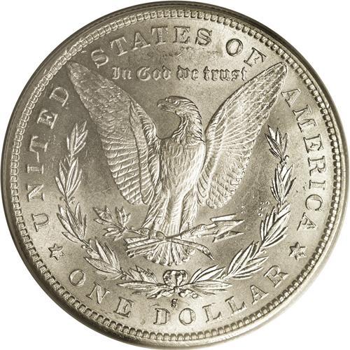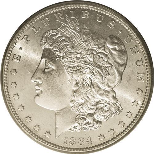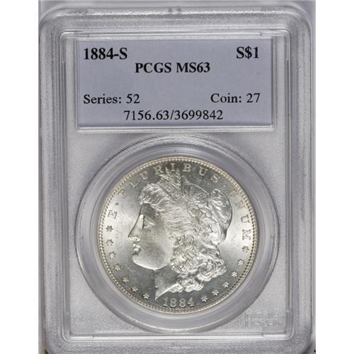 <B>1884-S<img border='0' src='http://www.heritagecoins.com/images/star.gif' width=10 height=10>$1> MS63 PCGS.</B></I> Despite a mintage that was substantially smaller than the earlier S-Mint issues, the production total of more than 3 million coins does not immediately suggest the rarity of this date in Mint State grades. It seems that most of the mintage actually entered circulation near the time they were struck. Pieces that remained in government vaults may have been melted as a result of the Pittman Act of 1918. It seems that additional quantities entered circulation from the 1920s to the 1950s, yet few were saved by collectors. It is doubtful that many or any survived to the Treasury release of the early 1960s. It was not until the 1930s or possibly later that collectors began to recognize the rarity of this issue in Mint State grades, as circulated examples were always available.<BR> This is an amazing example of the conditionally rare 1884-S Morgan dollar. Both sides are fully brilliant with frosty silver luster. Although a few faint hairlines on each side limit the grade of this specimen, it has the first-glance appearance or eye appeal of a coin that grades MS64, or possibly MS65. Both sides are nicely detailed, and the surfaces exhibit the satiny, nearly reflective surfaces that are typical of the earlier San Francisco Mint silver dollars. Although technically a common date due to the existence of many circulated examples, this issue is one of the premier rarities in any and all Mint State grades. Population: 36 in 63, 16 finer (6/06).