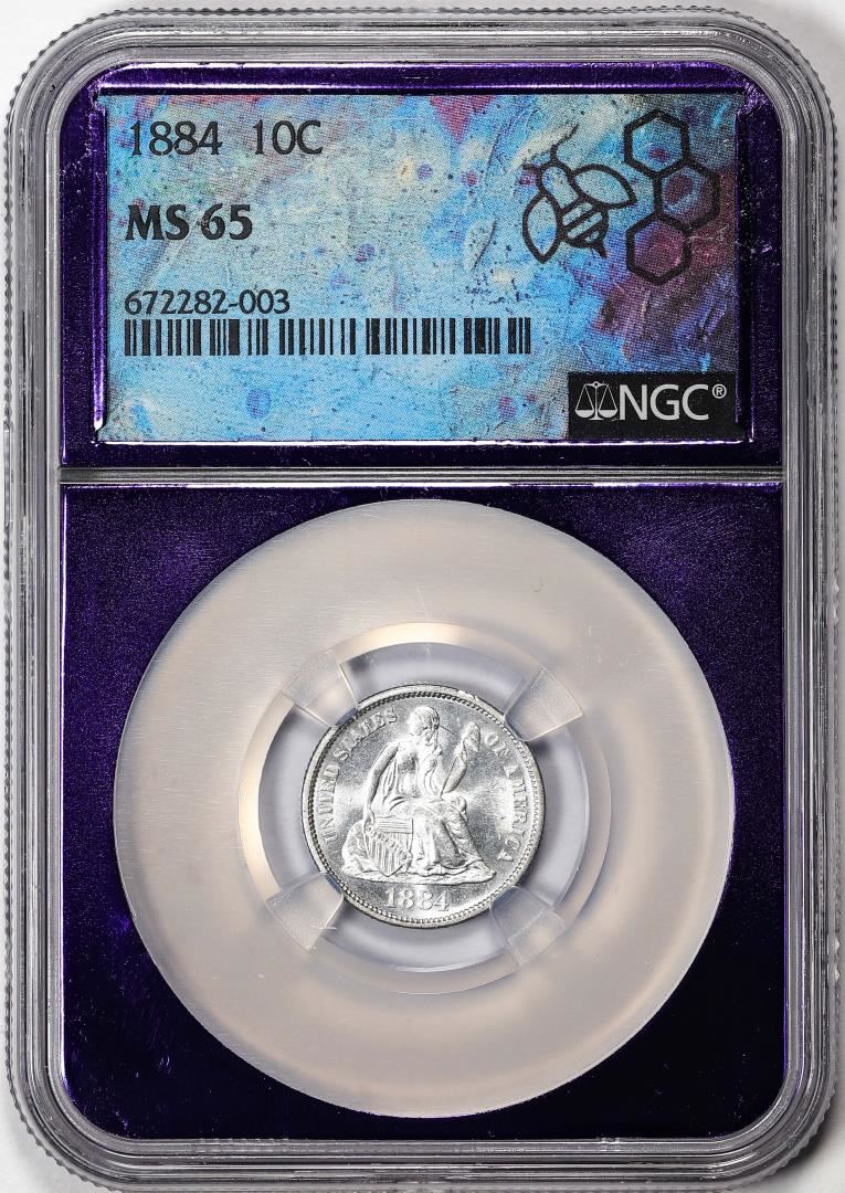 One 1884 Seated Dime Coin NGC MS65 Purple Core. NGC Certified.