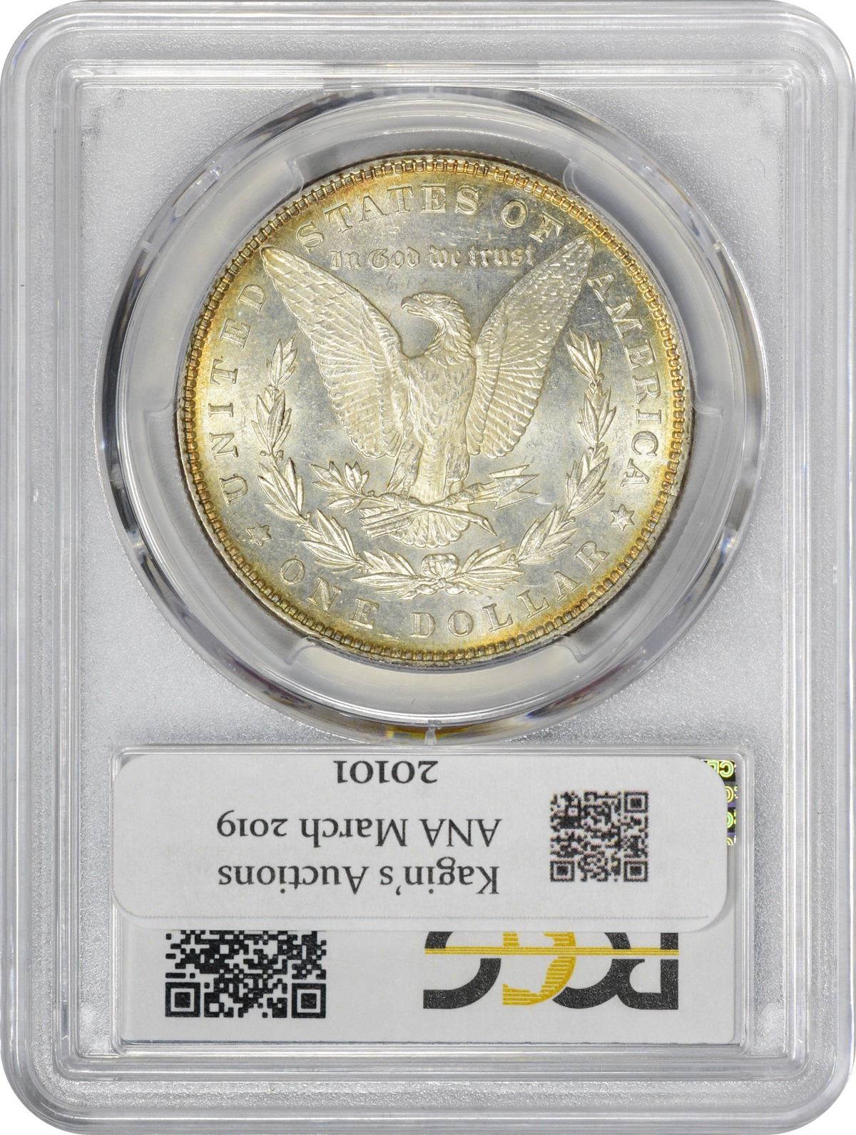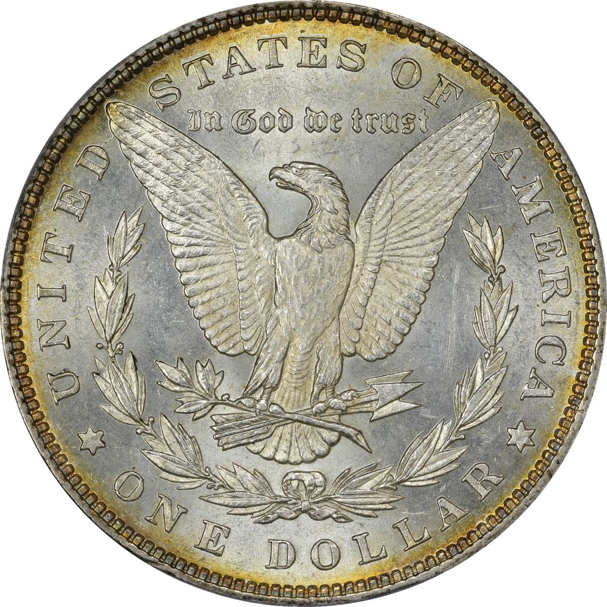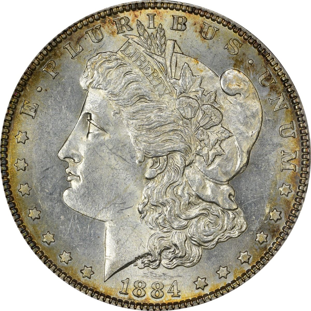 Brilliant, lustrous, and sharp, with just a few light obverse abrasions keeping this example of a popular die variety from a finer grade; the reverse is certainly finer than its assigned grade suggests. Warm peach-gold iridescence engages the rim on both sides. This popular variety features a noticeable dot after the designer’s initial, M, on the neck at Liberty’s lowest tress; a small dot is seen at the M on the reverse ribbon as well in this interesting variety. The dots are uniformly round and probably placed in the dies for a reason, and various varieties are known with differently sized dots in both places and in combinations of size and location. PCGS #7150