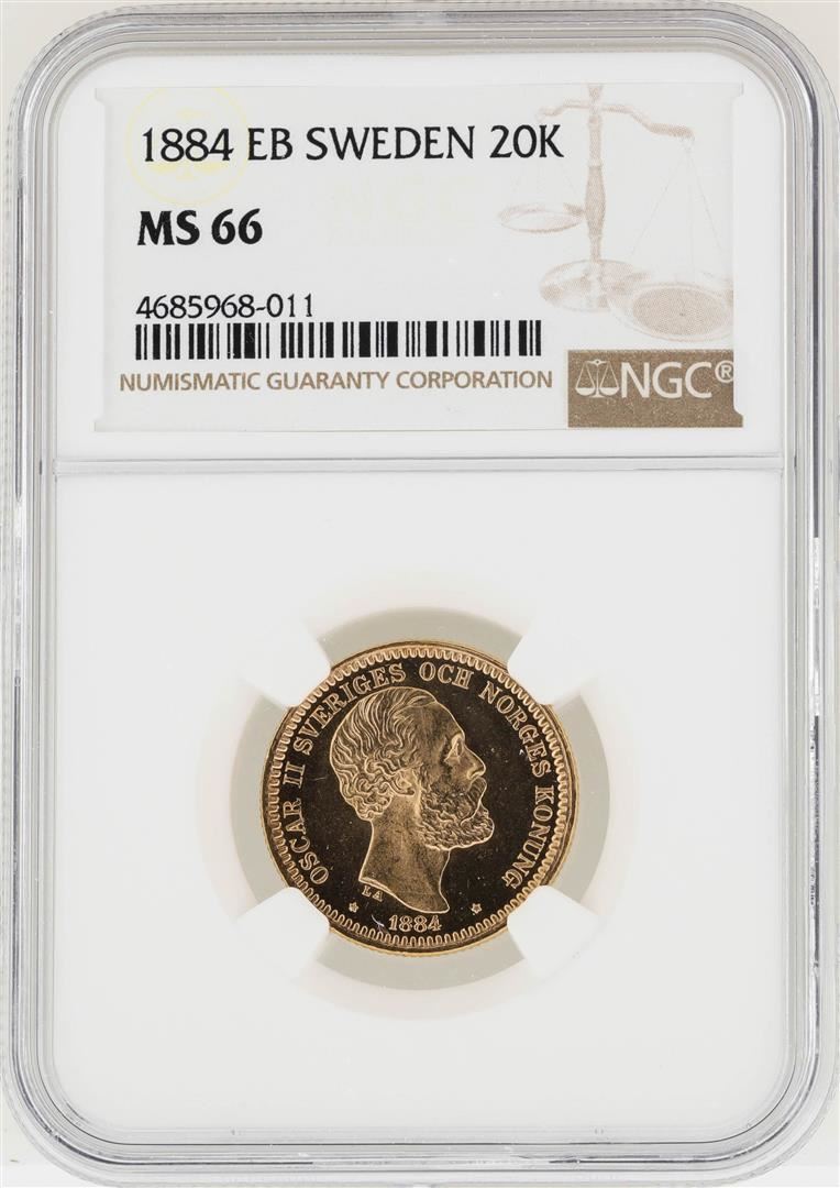 One 1884EB Sweden 20 Kronors Gold Coin NGC MS66. NGC Certified.
