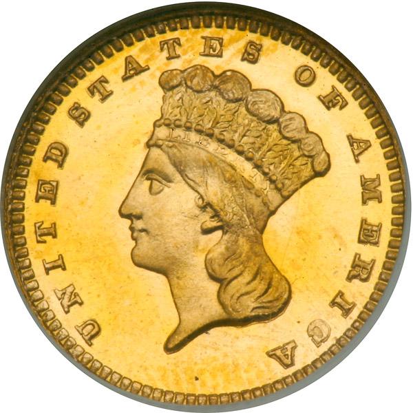 1885 $1 Gold Indian. NGC graded Proof 68 Cameo. Near perfect Gem Cameo Proof type Gold Dollar. The watery mirrored surfaces are immaculate as are the delicate frosted devices. A brilliant untoned example of the type. Only 1105 Proofs struck. It is hard to imagine such a coin still in existence after so many years. Truly, this one displays dramatic freshness and originality under a loupe. The mint's production of Proof Gold Dollars beginning in 1884 from the low totals prior to that. This 1885 has similar mintage to the 1884. Even though the mintage figure suggests easy obtainability, nothing could be farther from the truth. In fact, we estimate fewer than 50 examples of this issue are extant, the majority of grading below the Gem PR65 level. Pop 2; none finer (PCGS # 87635) .