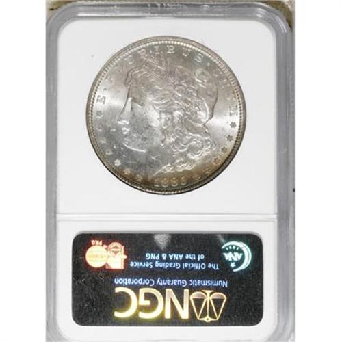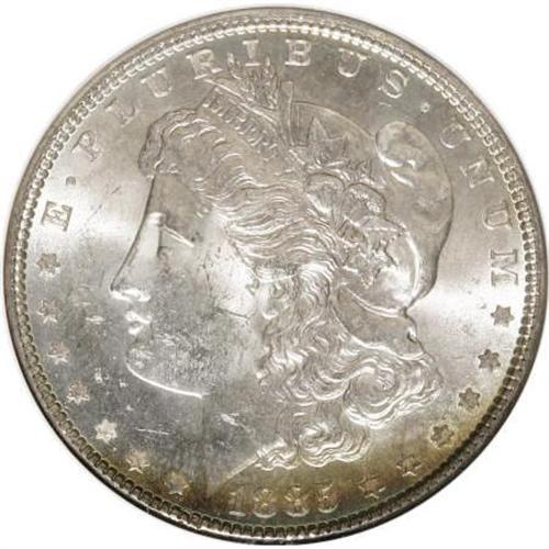 <B>1885 $1 MS63</B></I><img src="/images/star.gif" width="10" height="10" alt="" border="0"><B> NGC.</B></I> NGC Census: (10333/32277). PCGS Population (11777/26165). Mintage: 17,787,768. Numismedia Wsl. Price for NGC/PCGS coin in MS63: $41. (#7158)<BR><BR><B>Coin Engraver:</B> George T. Morgan<BR><BR><b>Shipping:</b> Coins & Currency (<a target="_blank" href="http://www.heritageauctions.com/common/shipping.php">view shipping information</a>)