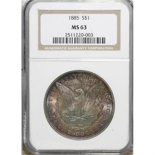 <B>1885 $1 MS63 NGC.</B></I> . NGC Census: (10333/32277). PCGS Population (11777/26165). Mintage: 17,787,768. Numismedia Wsl. Price for NGC/PCGS coin in MS63: $41. (#7158)<BR><BR><B>Coin Engraver:</B> George T. Morgan<BR><BR><b>Shipping:</b> Coins & Currency (<a target="_blank" href="http://www.heritageauctions.com/common/shipping.php">view shipping information</a>)
