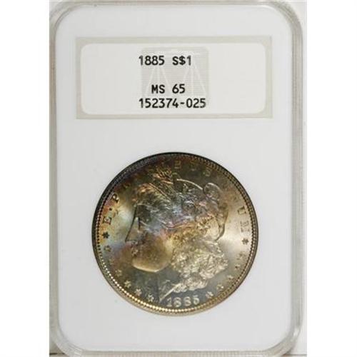 <B>1885 $1 MS65 NGC.</B></I> NGC Census: (7939/1494). PCGS Population (6775/1193). Mintage: 17,787,768. Numismedia Wsl. Price for NGC/PCGS coin in MS65: $172. (#7158)<BR><BR><B>Coin Engraver:</B> George T. Morgan<BR><BR><b>Shipping:</b> Coins & Currency (<a target="_blank" href="http://www.heritageauctions.com/common/shipping.php">view shipping information</a>)
