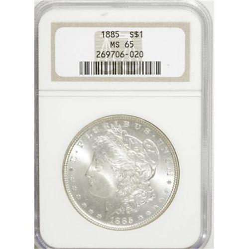 <B>1885 $1 MS65 NGC.</B></I> NGC Census: (8043/1506). PCGS Population (6788/1210). Mintage: 17,787,768. Numismedia Wsl. Price for NGC/PCGS coin in MS65: $172. (#7158)<BR><BR><B>Coin Engraver:</B> George T. Morgan<BR><BR><b>Shipping:</b> Coins & Currency (<a target="_blank" href="http://www.heritageauctions.com/common/shipping.php">view shipping information</a>)