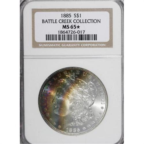 <B>1885 $1 MS65 </B></I><img src="/images/star.gif" width="10" height="10" alt="" border="0"><B> NGC.</B></I> Ex: Battle Creek Collection. Both sides of this amazing Gem are strongly lustrous with bold detail. The reverse is essentially brilliant, while arcs of magenta, yellow-green, mint, violet-blue, and goldenrod drape the left obverse.<BR><BR><B>Coin Engraver:</B> George T. Morgan<BR><BR><b>Shipping:</b> Coins & Currency (<a target="_blank" href="http://www.heritageauctions.com/common/shipping.php">view shipping information</a>)