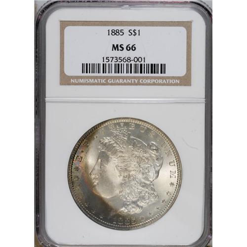 <B>1885 $1 MS66 NGC.</B></I> NGC Census: (1300/157). PCGS Population (1102/73). Mintage: 17,787,768. Numismedia Wsl. Price: $320. (#7158)<BR><BR><b>Shipping:</b> Coins & Currency (<a target="_blank" href="http://www.heritageauctions.com/common/shipping.php">view shipping information</a>)