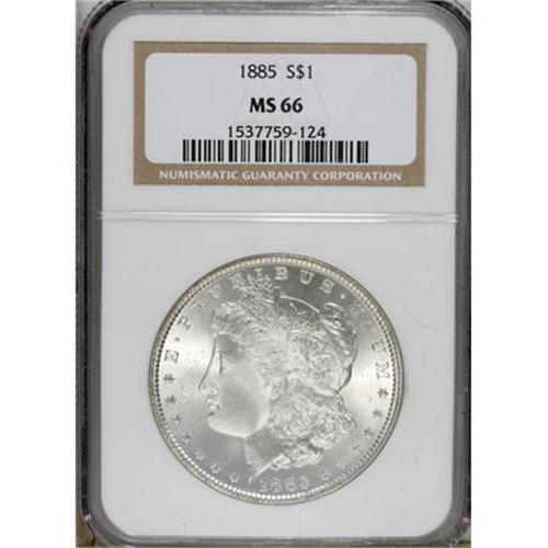 <B>1885 $1 MS66 NGC.</B></I> NGC Census: (1323/161). PCGS Population (1105/73). Mintage: 17,787,768. Numismedia Wsl. Price for NGC/PCGS coin in MS66: $320. (#7158)<BR><BR><b>Shipping:</b> Coins & Currency (<a target="_blank" href="http://www.heritageauctions.com/common/shipping.php">view shipping information</a>)