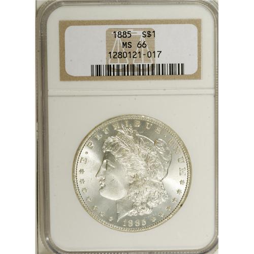 <B>1885 $1 MS66 NGC.</B></I> NGC Census: (2622/314). PCGS Population (1105/73). Mintage: 17,787,768. Numismedia Wsl. Price for NGC/PCGS coin in MS66: $320. (#7158)<BR><BR><b>Shipping:</b> Coins & Currency (<a target="_blank" href="http://www.heritageauctions.com/common/shipping.php">view shipping information</a>)