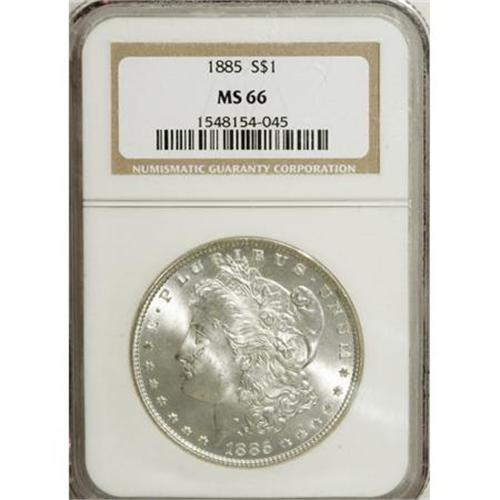 <B>1885 $1 MS66 NGC.</B></I> NGC Census: (1331/163). PCGS Population (1117/73). Mintage: 17,787,768. Numismedia Wsl. Price for NGC/PCGS coin in MS66: $320. (#7158)<BR><BR><B>Coin Engraver:</B> George T. Morgan<BR><BR><b>Shipping:</b> Coins & Currency (<a target="_blank" href="http://www.heritageauctions.com/common/shipping.php">view shipping information</a>\)