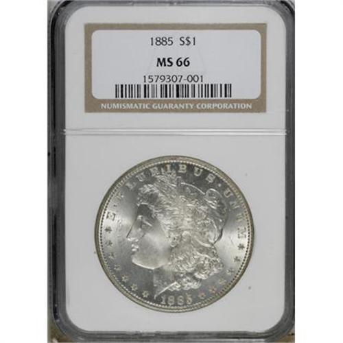 <B>1885 $1 MS66 NGC.</B></I> NGC Census: (1355/166). PCGS Population (1161/72). Mintage: 17,787,768. Numismedia Wsl. Price for NGC/PCGS coin in MS66: $325. (#7158)<BR><BR><B>Coin Engraver:</B> George T. Morgan<BR><BR><b>Shipping:</b> Coins & Currency (<a target="_blank" href="http://www.heritageauctions.com/common/shipping.php">view shipping information</a>)