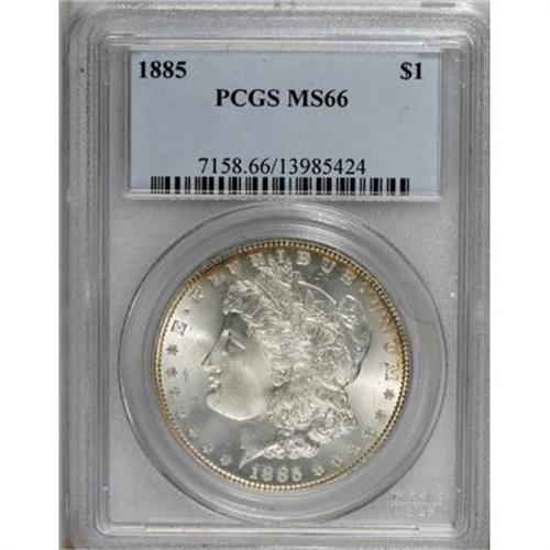 <B>1885 $1 MS66 PCGS.</B></I> PCGS Population (1127/72). NGC Census: (1333/161). Mintage: 17,787,768. Numismedia Wsl. Price for NGC/PCGS coin in MS66: $320. (#7158)<BR><BR><B>Coin Engraver:</B> George T. Morgan<BR><BR><b>Shipping:</b> Coins & Currency (<a target="_blank" href="http://www.heritageauctions.com/common/shipping.php">view shipping information</a>)