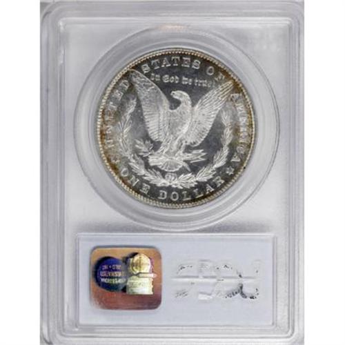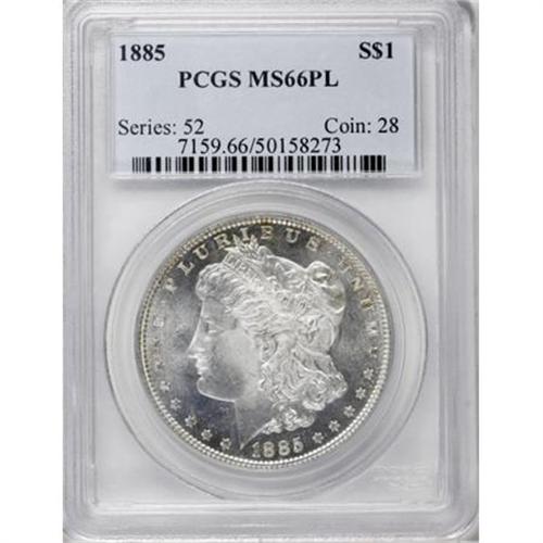 <B>1885 $1 MS66 Prooflike PCGS.</B></I> The brilliant mirrors provide stark contrast against the frosty devices. The obverse is very nearly untoned, while the reverse offers a rim with golden and russet accents. The only marks worthy of individual note are a couple of crisscross scrapes on the eagle's breast. A small grease spot is noted in back of Liberty's eye. Population: 34 in 66, 2 finer (12/07).<BR><BR><B>Coin Engraver:</B> George T. Morgan<BR><BR><b>Shipping:</b> Coins & Currency (<a target="_blank" href="http://www.heritageauctions.com/common/shipping.php">view shipping information</a>)