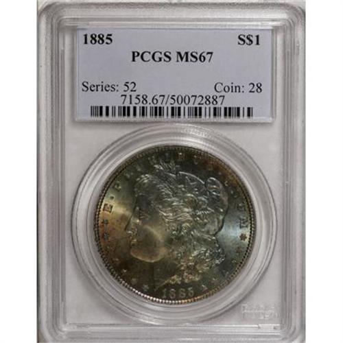 <B>1885 $1 MS67 PCGS.</B></I> Boldly struck with fantastic aquamarine, crimson, and gold iridescence on the obverse that contrasts with the reverse's brilliance. Carefully preserved with a couple of small marks on each side. PCGS has graded just one finer representative (1/08).<BR><I>From The Jimmy G. PCGS Registry Collection of Morgan Dollars with Varieties.</B></I><BR><BR><B>Coin Engraver:</B> George T. Morgan<BR><BR><b>Shipping:</b> Coins & Currency (<a target="_blank" href="http://www.heritageauctions.com/common/shipping.php">view shipping information</a>)