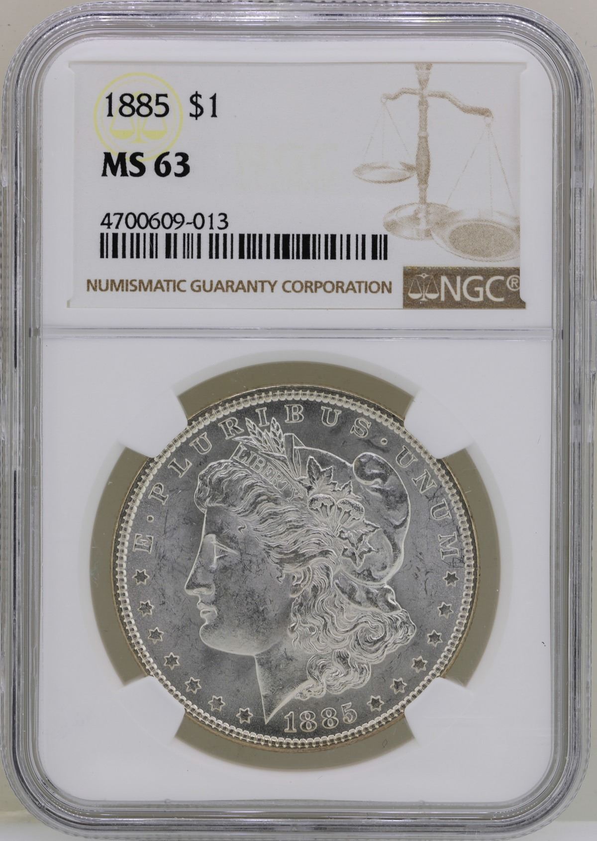 One 1885 $1 Morgan Silver Dollar Coin NGC MS63.