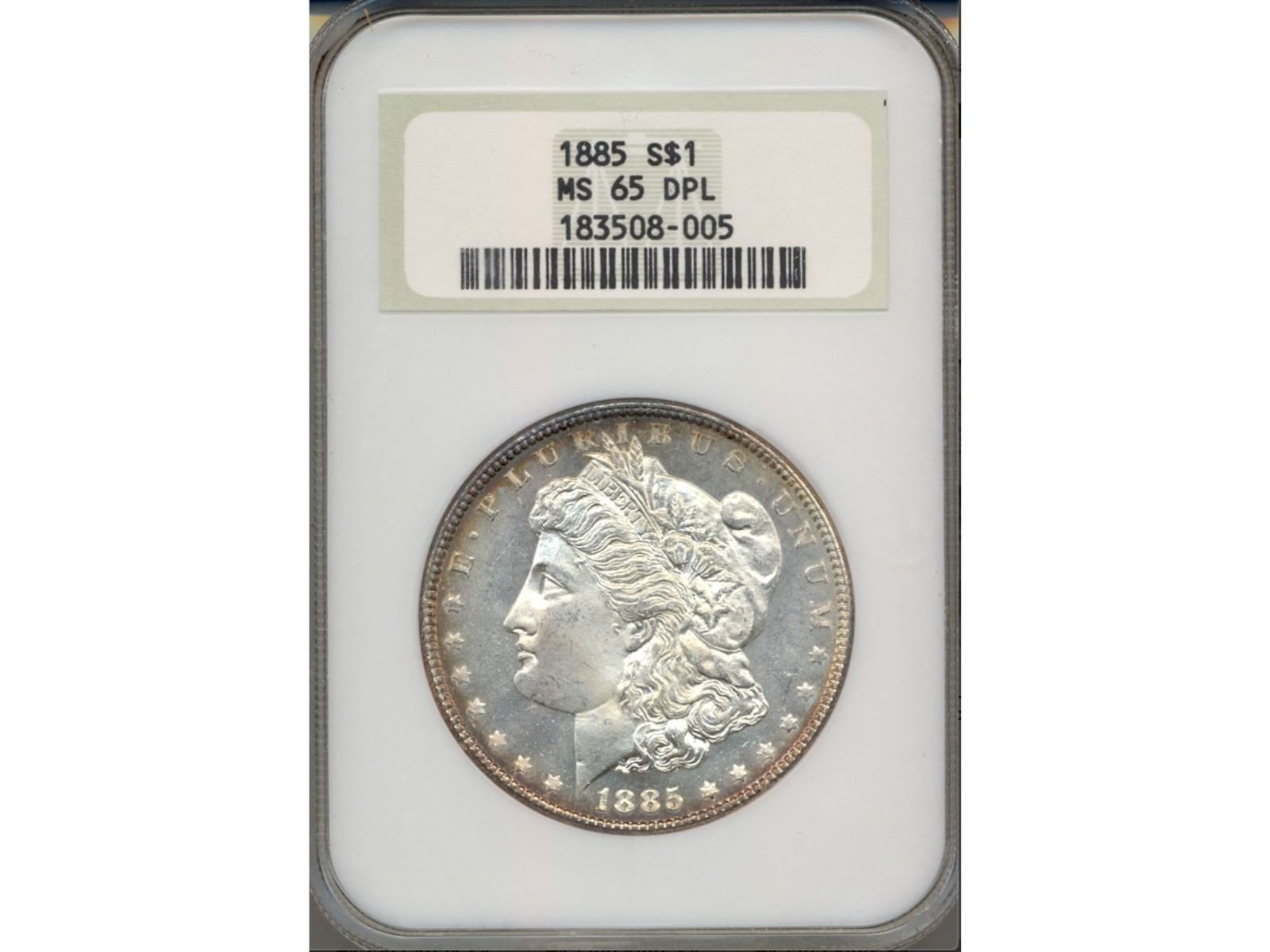 One 1885 $1 Morgan Silver Dollar Coin NGC MS65DPL.