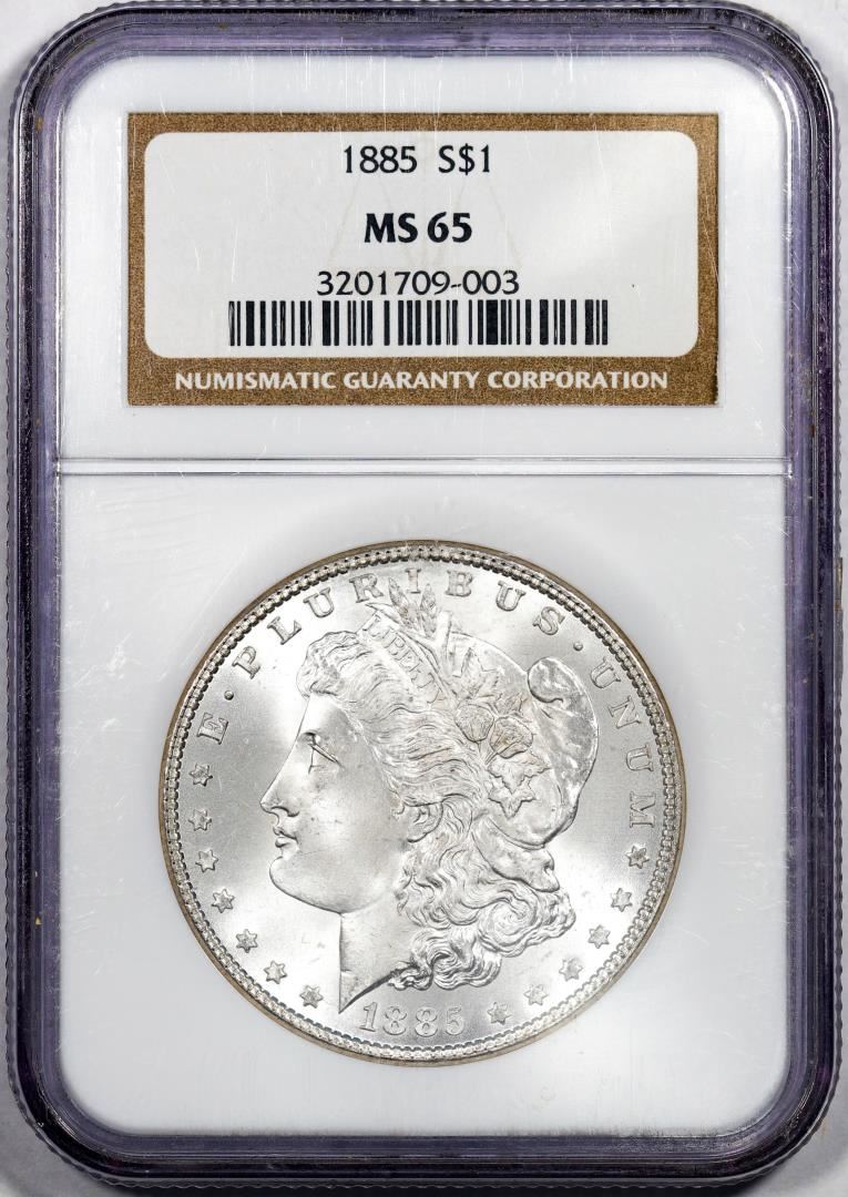 One 1885 $1 Morgan Silver Dollar Coin NGC MS65.