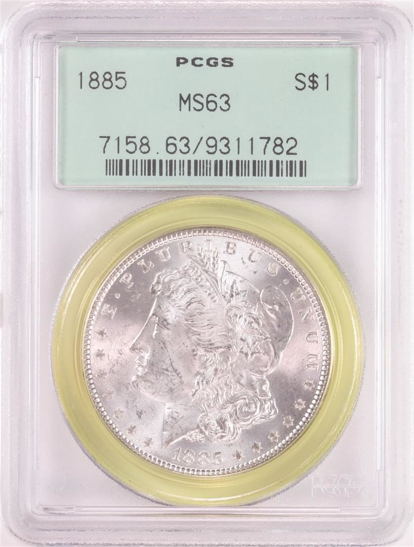 One 1885 $1 Morgan Silver Dollar Coin PCGS MS63 Old Green Holder. PCGS Graded.