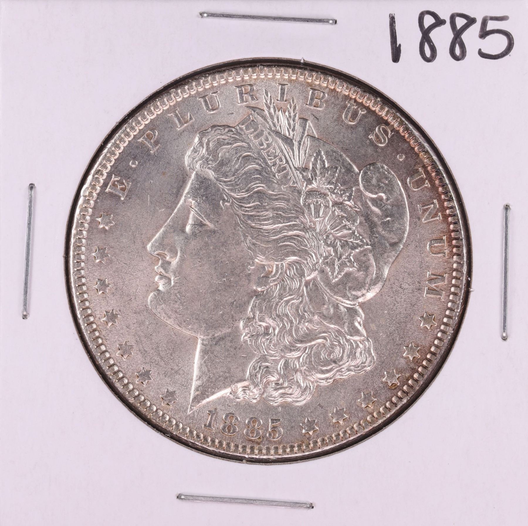 One 1885 $1 Morgan Silver Dollar Coin.