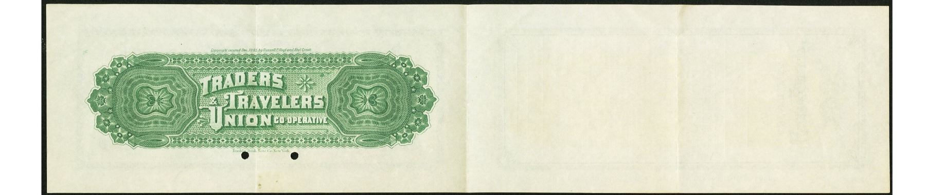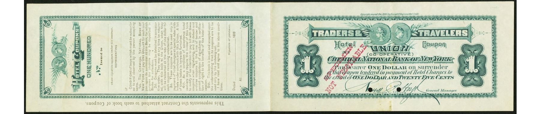 One 1885 $1 New York Traders and Travelers Union Hotel Coupon.