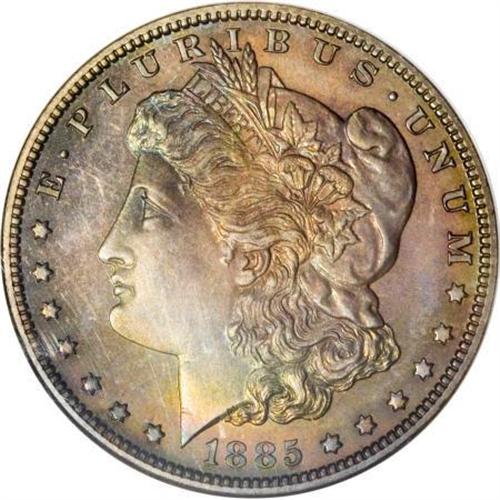<B>1885 $1 PR65 NGC.</B></I> Deep blue-green, radish-red, and sun-gold patina encompasses this penetratingly struck and mark-free Gem. A treat for the connoisseur of colorfully toned silver coinage. A mintage of only 930 proofs contrasts with the 17.787 million business strikes produced. Census: 30 in 65 Cameo, 29 finer (10/07).<BR><I>From The Fleur Wales-Baillie Collection.</B></I><BR><BR><B>Coin Engraver:</B> George T. Morgan<BR><BR><b>Shipping:</b> Coins & Currency (<a target="_blank" href="http://www.heritageauctions.com/common/shipping.php">view shipping information</a>)