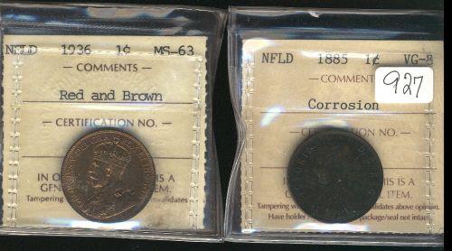 1885 1 cent ICCS VG-8 "corrosion", 1936 ICCS MS-63 red/brown.