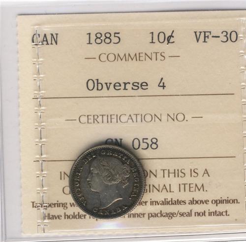 1885 10¢. Key date coin graded ICCS VF 30 Obv 4. A sharp coin.