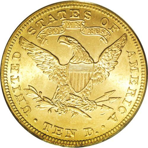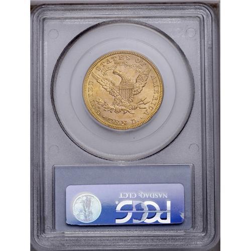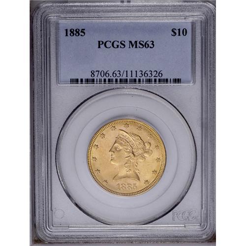 <B>1885<$10> MS63 PCGS.</B></I> The 1885 eagle is available in the lower Mint State grades with a little patience and searching. It becomes more challenging in MS63 (the level of preservation of the present coin) and finer Uncirculated grades. Lustrous surfaces emit pleasing luster, and are covered in apricot-gold patination. Evenly distributed small contact marks, mostly on the obverse, define the grade. Population: 30 in 63, 9 finer (4/06).