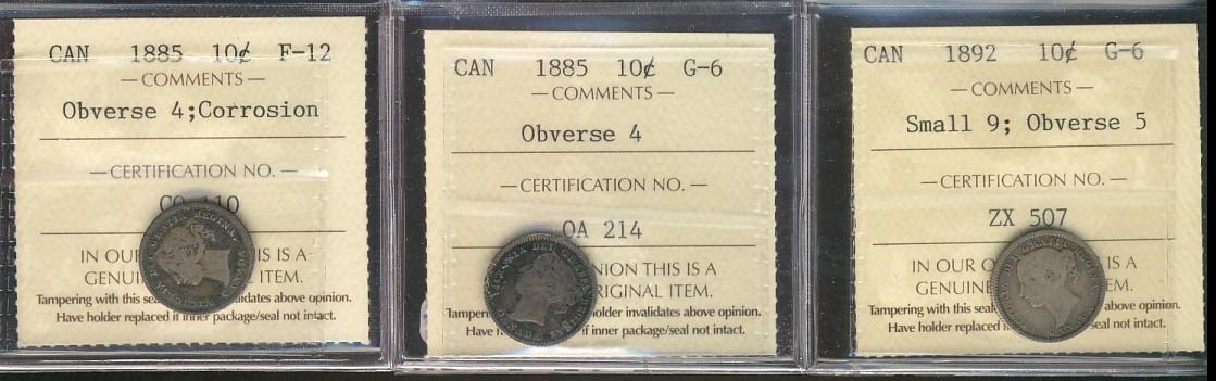 1885 10¢ Obv 4 & 1892 Sml 9 Obv 5 ICCS G6. Aong with 1885 F12 designated Corroded. Lot of 3 coins.