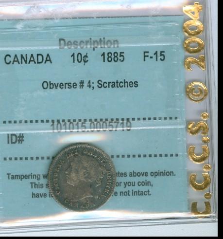 1885 10¢ Obv 4 CCCS F15. Designated with scratches.